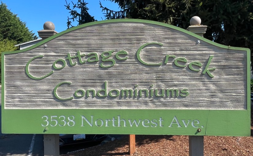 Cottage Creek Condominiums is a complex of 44 units located at 3538 Northwest Ave., Bellingham, WA 98225. It has easy access to I-5 and WTA bus stops 2085 and 3212. Originally built in 1979 as an apartment complex, it was remodeled in 2000 and converted into condominiums. The community has a rental cap of 30%. The complex is 70% or greater owner occupied, and is managed by INTEGRA Condominium Association Management, Inc. It is part of Bellingham’s Birchwood Neighborhood, and within a 15 minute walk of Shuksan Middle School, Shuksan Meadows Park, Maplewood/Mcleod Park (under development), Bellingham Fire Department Station 5, Rite Aid, Park Manor Shopping Center, and many other businesses.